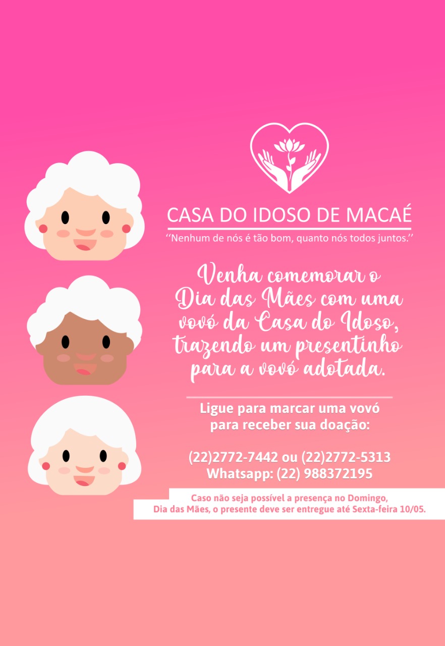 A Casa do idoso lançou a campanha ” adote uma vovó ” , a campanha tem como objetivo presentear uma idosa com uma lembrança para o dia das mães .