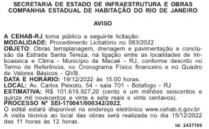 Foi publicado no Diário Oficial do Estado , o chamamento para licitação para as obras de terraplanagem, drenagem e pavimentação e conclusão da estrada Santa Tereza , na ligação entre as localidades de Imboassica e Clima . É um investimento de 101.615.927,20 do Governo do Estado em Macaé. A licitação está prevista para dia 19/12 ás 15h.