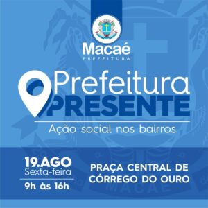 Com objetivo de promover políticas públicas nos bairros e aproximar a população dos serviços públicos da Prefeitura de Macaé, a próxima edição da Prefeitura Presente será no distrito do Córrego do Ouro, o evento será no dia 19 de agosto das 9 h às 16h.