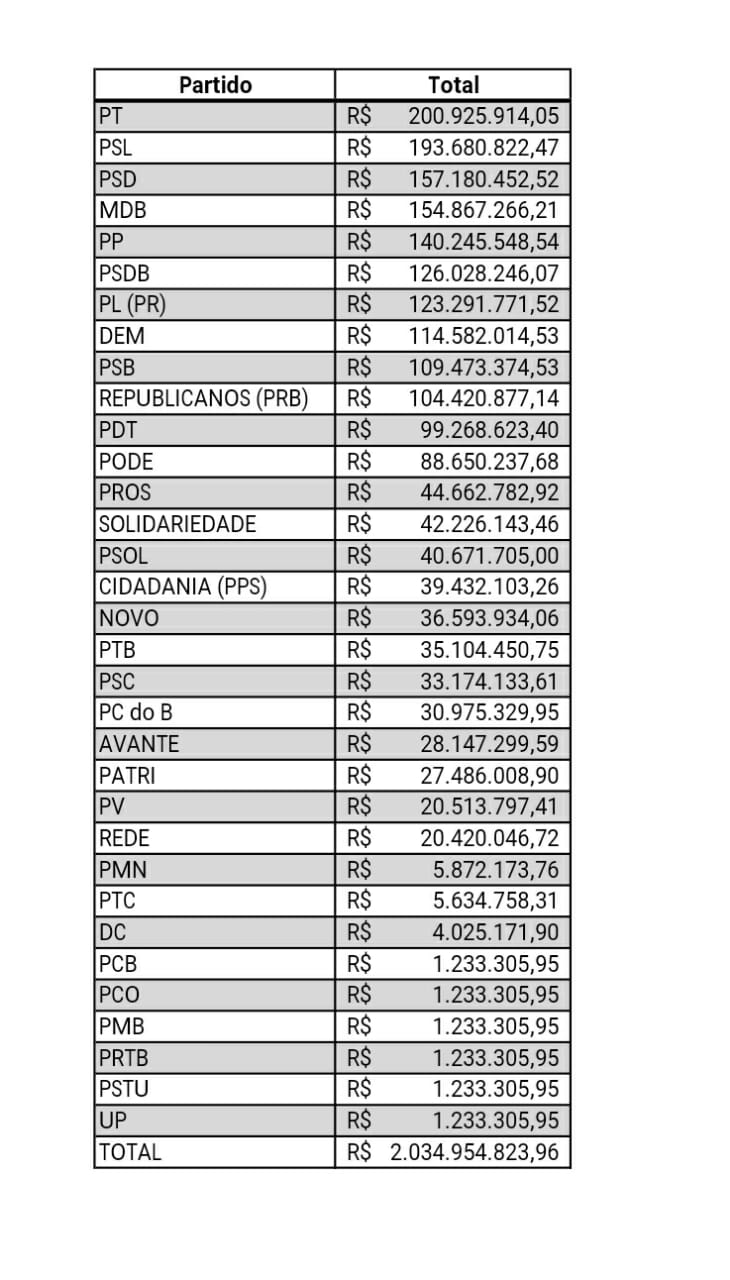 PT E PSL LIDERAM EM RECURSOS DE RECEBIMENTO DO FUNDO PARTIDÁRIO:VEJA QUANTO CADA PARTIDO VAI RECEBER NAS ELEIÇÕES MUNICIPAIS 2020